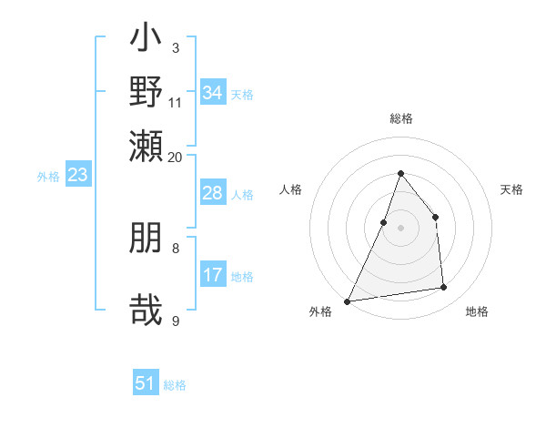 小野瀬 朋哉さんの総格は51画の3点!