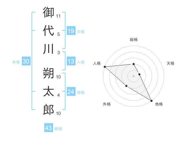 御代川 朔太郎さんの総格は43画の2点!