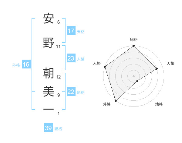安野 朝美一さんの外格は16画の5点!