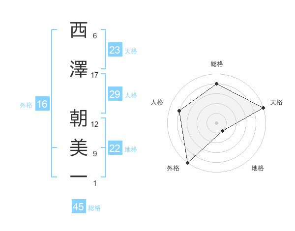 西澤 朝美一さんの総格は45画の4点!