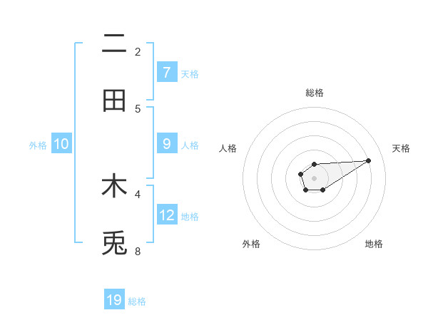 二田 木兎さんの総格は19画の1点!