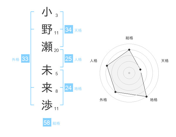 小野瀬 未来渉さんの総格は58画の4点!