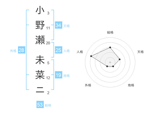小野瀬 未菜ニさんを姓名の画数から五運を鑑定