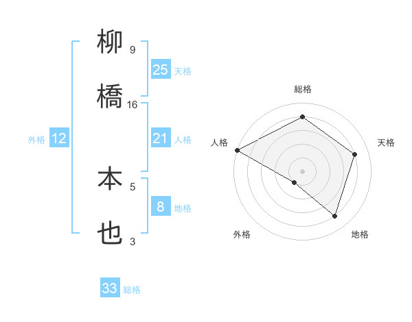 柳橋 本也さんの総格は33画の4点!