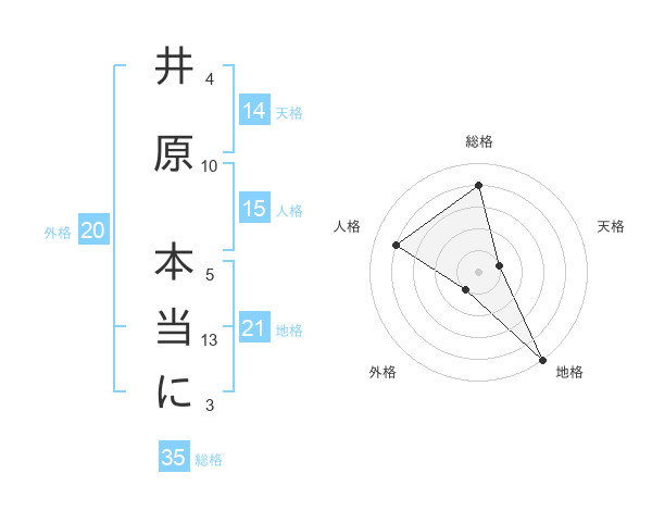 占い結果は姓名判断である以上、良い場合も悪い場合もありますが、決してお名前を誹謗中傷するものでなく、画数の自動計算によって得られたものです。また、本サイトの検索によって得られた鑑定結果で、第三者を誹謗中傷したり名誉を棄損するような行為を禁じます。