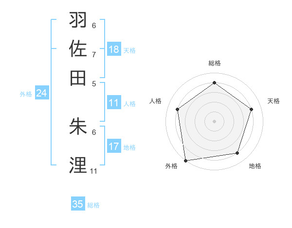 羽佐田 朱浬さんの総格は35画の4点!