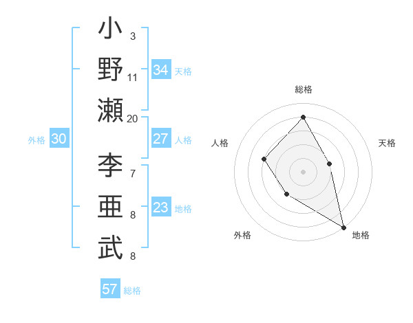 小野瀬 李亜武さんを姓名の画数から五運を鑑定