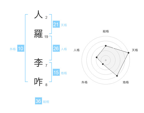 人羅 李咋さんの天格は21画の5点!