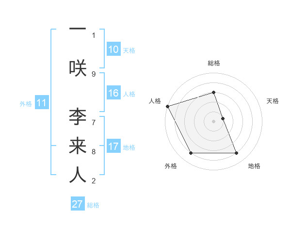 一咲 李来人さんを姓名の画数から五運を鑑定