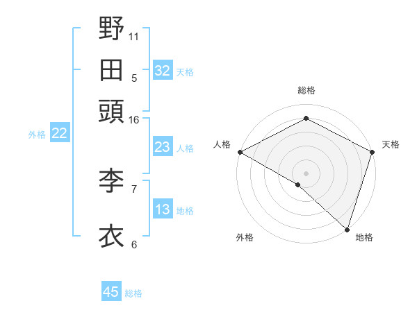 野田頭 李衣さんを姓名の画数から五運を鑑定
