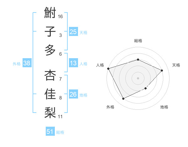 鮒子多 杏佳梨さんの総格は51画の3点!