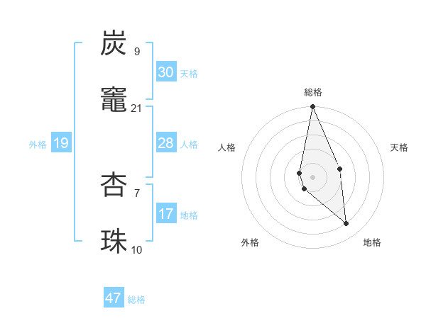 炭竈 杏珠さんの総格は47画の5点!