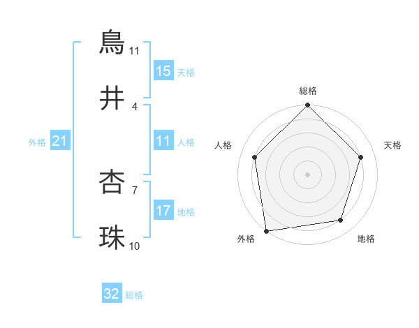 鳥井 杏珠さんの総格は32画の5点!