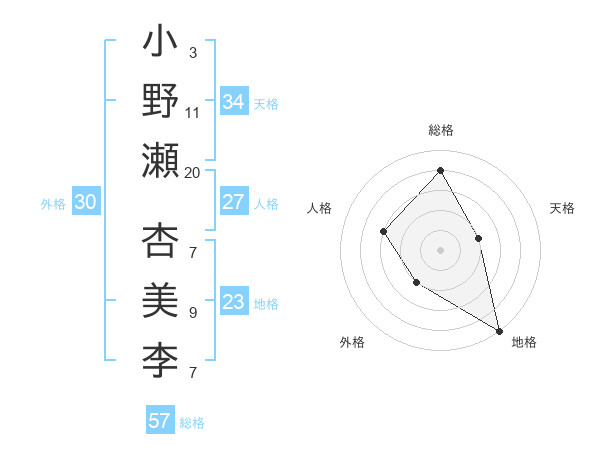 小野瀬 杏美李さんの総格は57画の4点!