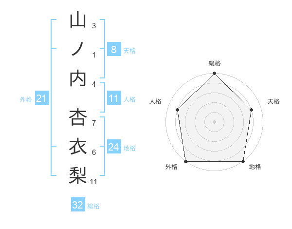 山ノ内 杏衣梨さんの総格は32画の5点!