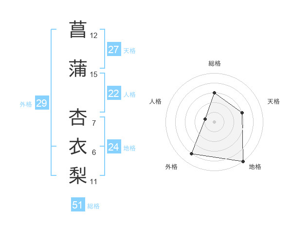 菖蒲 杏衣梨さんの総格は51画の3点!