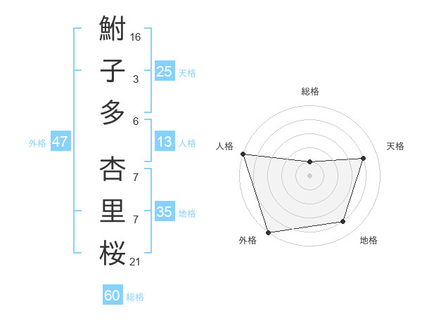 鮒子多 杏里桜さんを姓名の画数から五運を鑑定
