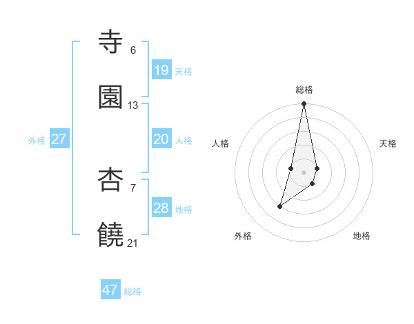 寺園 杏饒さんの総格は47画の5点!