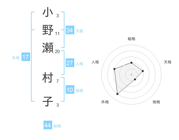 小野瀬 村子さんを姓名の画数から五運を鑑定