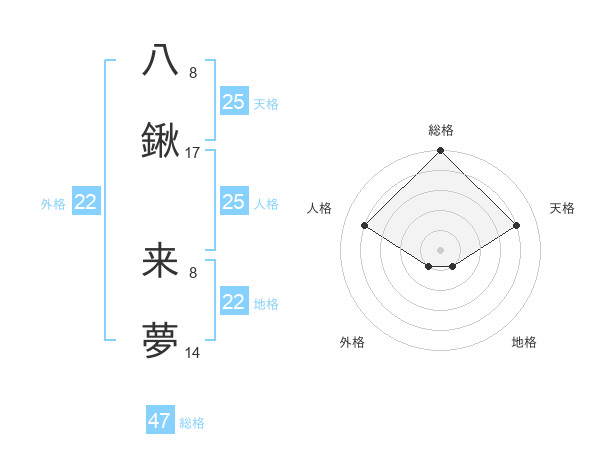 八鍬 来夢さんの総格は47画の5点!