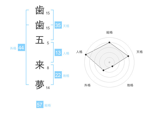 歯歯五 来夢さんの総格は57画の4点!