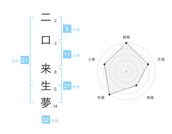 二口 来生夢さんの総格は32画の5点!
