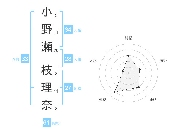 小野瀬 枝理奈さんを姓名の画数から五運を鑑定