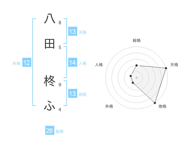 八田 柊ふさんの天格は13画の5点!