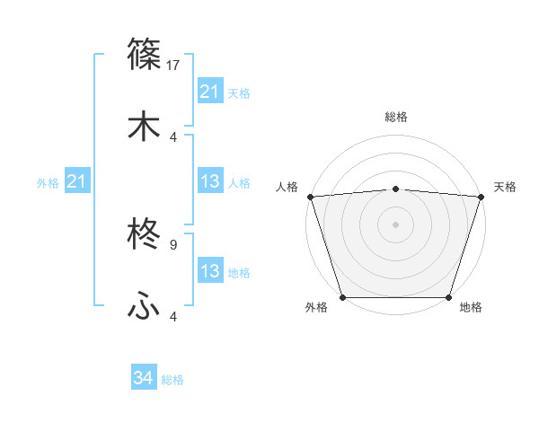 篠木 柊ふさんの総格は34画の2点!