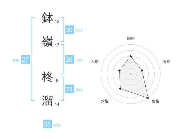 鉢嶺 柊溜さんの総格は53画の3点!