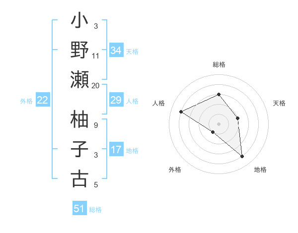 小野瀬 柚子古さんの総格は51画の3点!