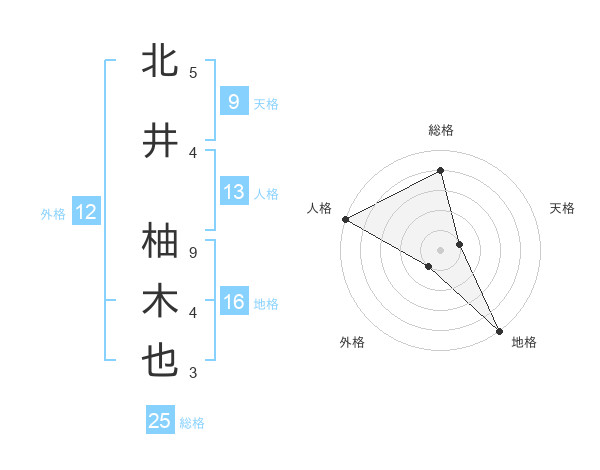 北井 柚木也さんの総格は25画の4点!