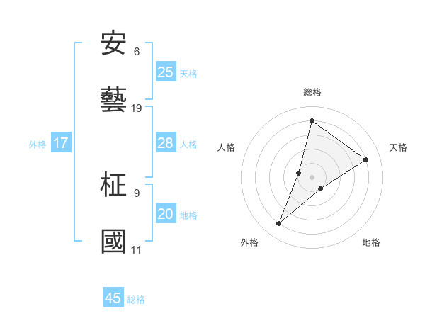 安藝 柾國さんの総格は45画の4点!
