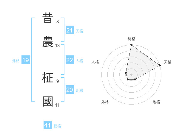 昔農 柾國さんの天格は21画の5点!
