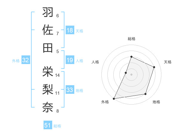 羽佐田 栄梨奈さんの総格は51画の3点!