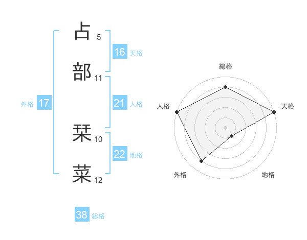 占い結果は姓名判断である以上、良い場合も悪い場合もありますが、決してお名前を誹謗中傷するものでなく、画数の自動計算によって得られたものです。また、本サイトの検索によって得られた鑑定結果で、第三者を誹謗中傷したり名誉を棄損するような行為を禁じます。