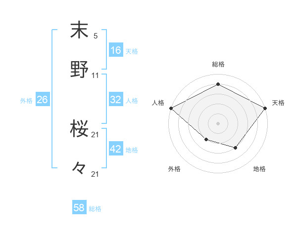 末野 桜々さんの総格は58画の4点!
