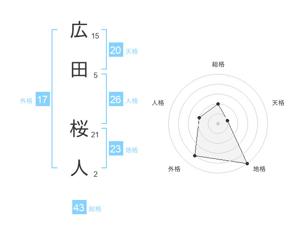 広田 桜人さんの総格は43画の2点!
