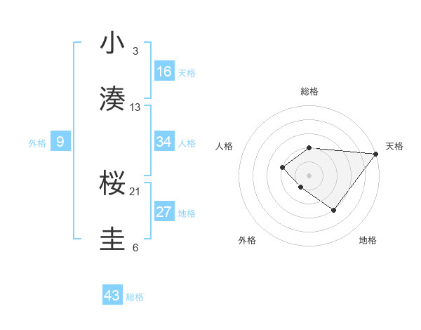 小湊 桜圭さんの総格は43画の2点!