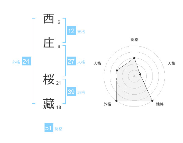 西庄 桜藏さんを姓名の画数から五運を鑑定