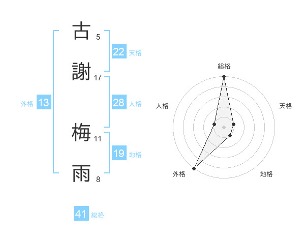古謝 梅雨さんを姓名の画数から五運を鑑定