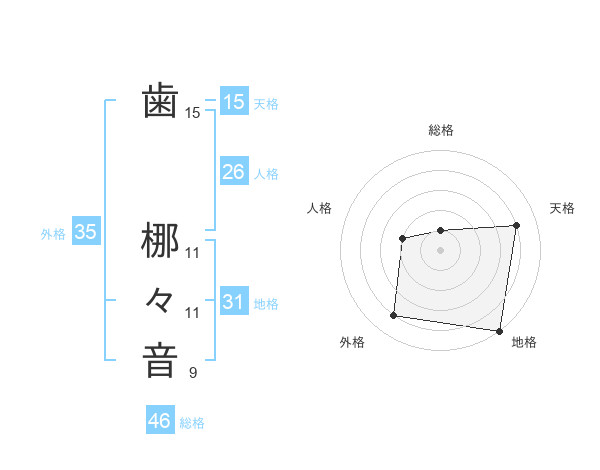 歯 梛々音さんの総格は46画の1点!