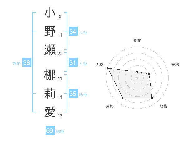 小野瀬 梛莉愛さんの総格は69画の1点!