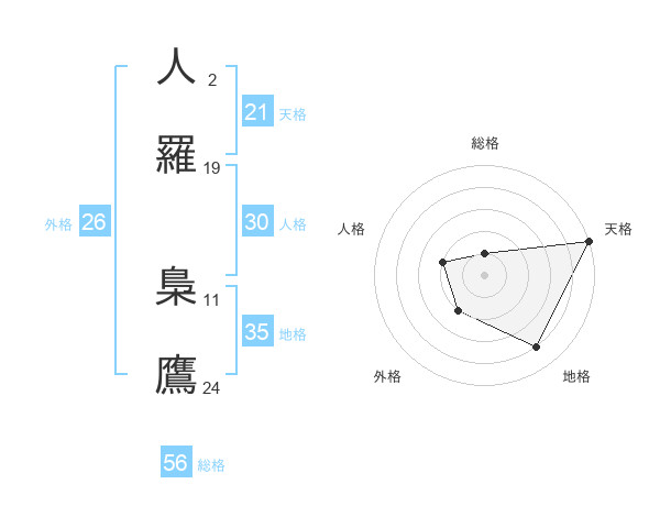 人羅 梟鷹さんを姓名の画数から五運を鑑定