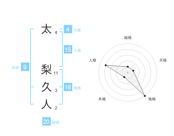 太 梨久人さんの総格は20画の1点!