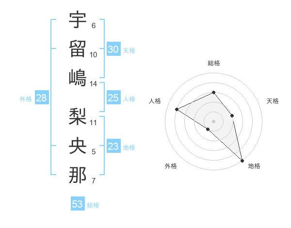 宇留嶋 梨央那さんの総格は53画の3点!