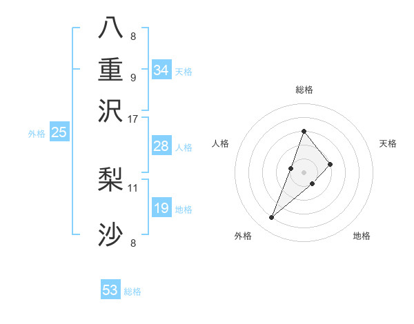 八重沢 梨沙さんの総格は53画の3点!