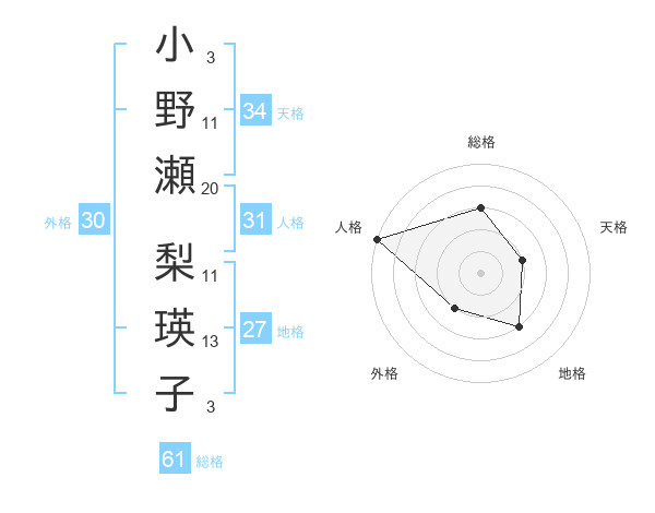 小野瀬 梨瑛子さんの総格は61画の3点!
