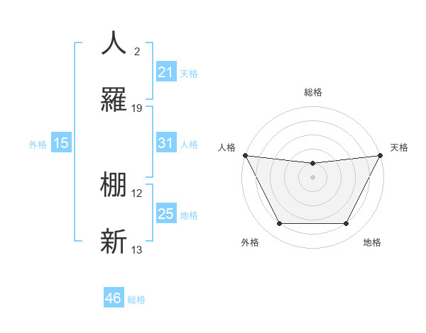 人羅 棚新さんの天格は21画の5点!