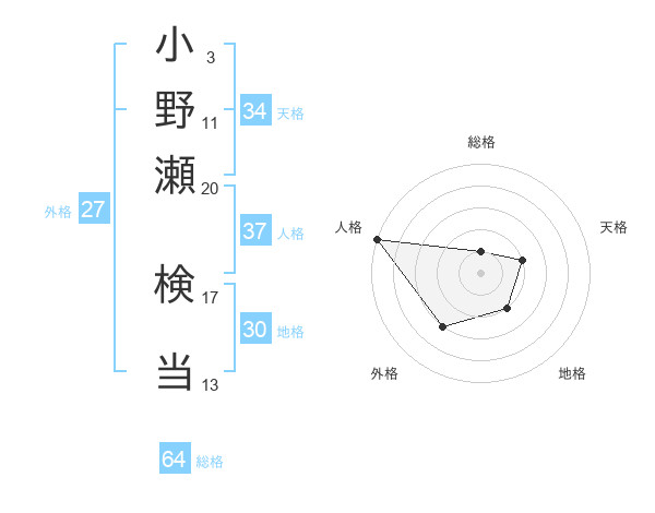 小野瀬 検当さんを姓名の画数から五運を鑑定